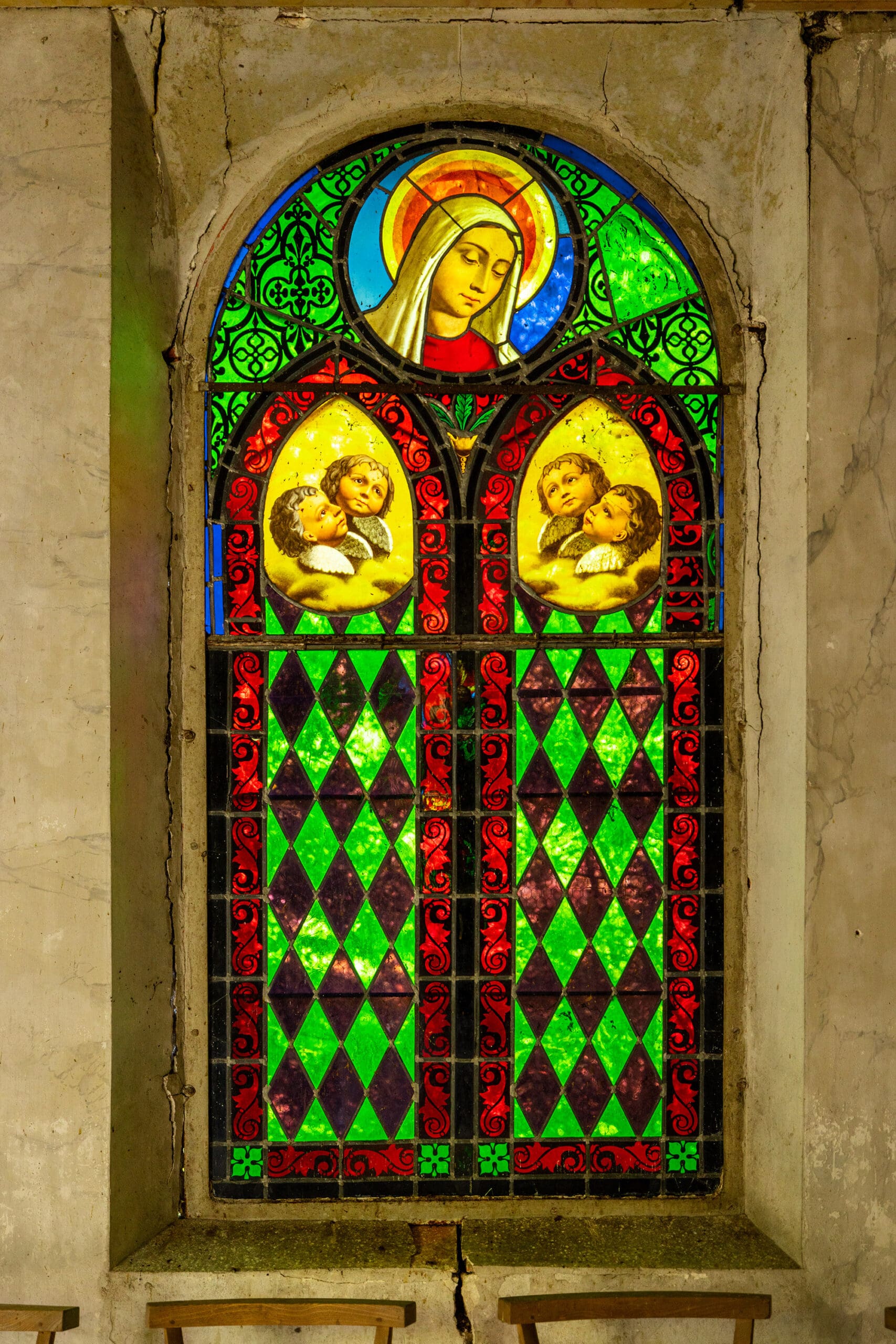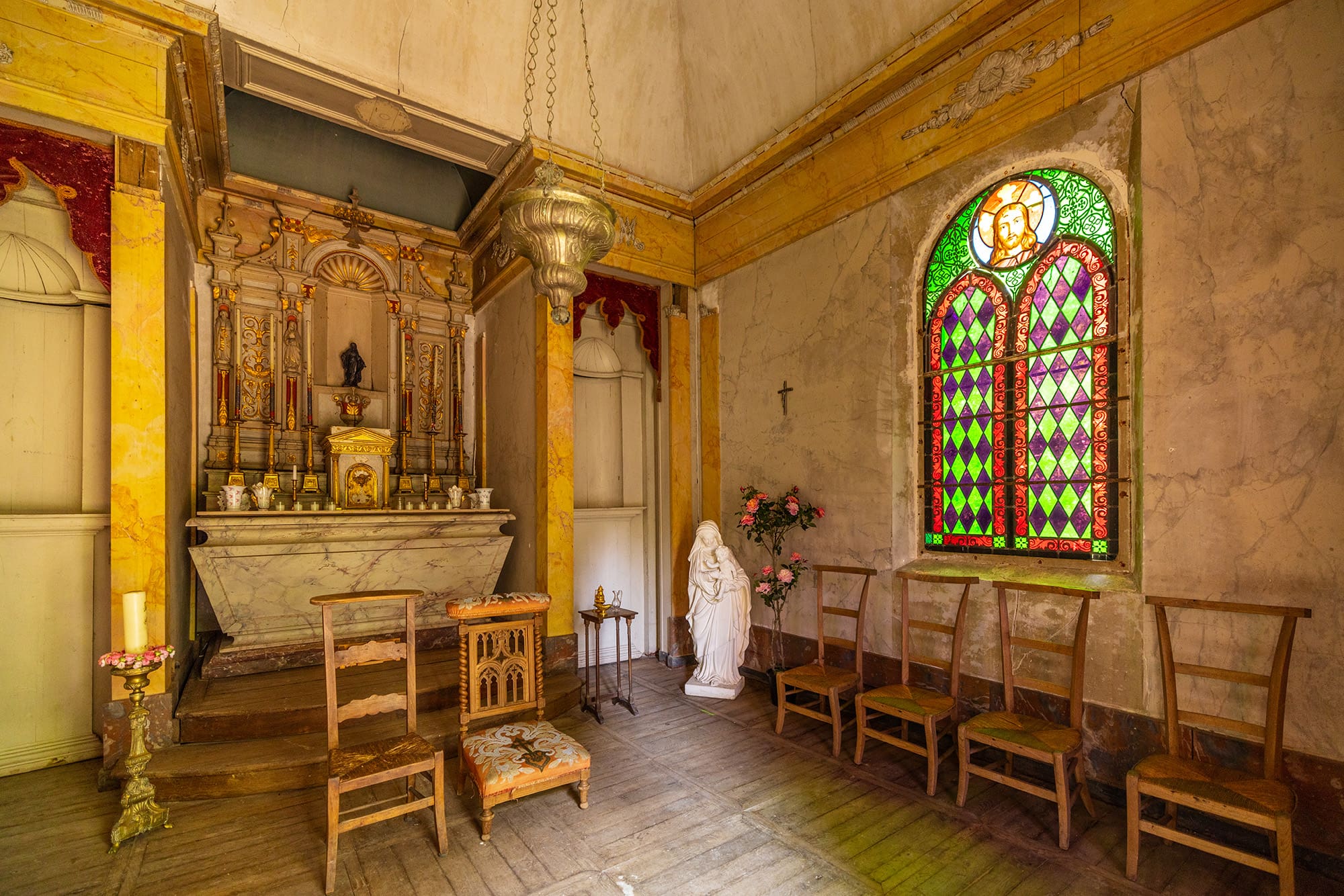 La chapelle actuelle du château de Foolz est achevée en 1849 à l’initiative de Marie Alix Lucas. Les vitraux, ornés de ses initiales entrelacées, témoignent de cette campagne de construction et de la volonté d’inscrire la mémoire des propriétaires dans l’architecture du lieu.